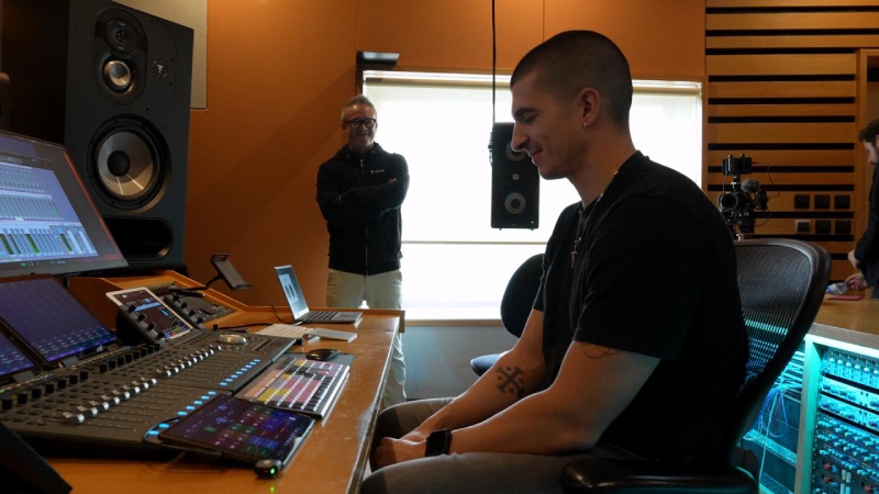 O rapper esteve na sessão com a dupla de produtores que o tem acompanhado desde o álbum MDID (2023), os 2LO, formados por Gonçalo Lemos e Leonardo Pinto. “Eu só tinha experienciado o Atmos numa sala de cinema, portanto, isto agora foi uma coisa muito mais localizada e particular”, partilha Gonçalo Lemos com o Rimas e Batidas.