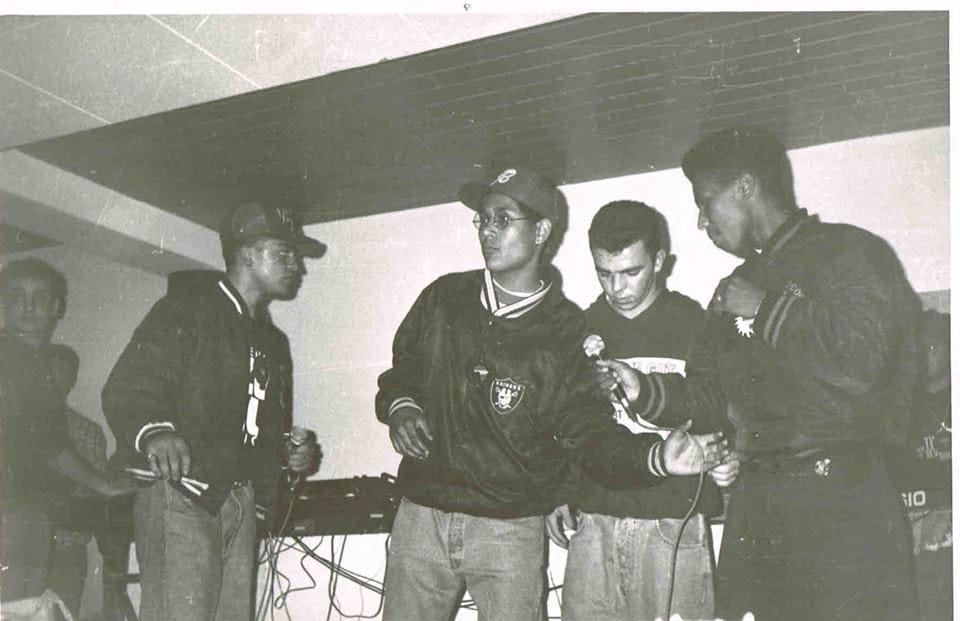 Tal como contámos em detalhe no âmbito do projecto Filhos do Meio, este movimento cultural ganhou força na Margem Sul do Tejo, muito em resposta à opressão neo-nazi que se fazia sentir nas ruas. Aliás, Nelson Neves tinha esta missão bem patente no seu grupo — tinha experiência a percorrer as ruas de Paris com os “caçadores de nazis”, pequenos gangues que se dedicavam a confrontar os skins, meio onde havia vários luso-descendentes e se ouvia rap.