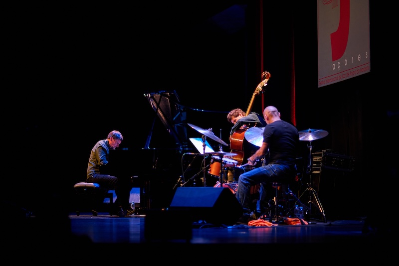 Depois de jantar foi então tempo de rumar ao Centro Cultural e de Congressos de Angra para mais uma dupla actuação. A abrir a noite apresentou-se o Samuel Lercher Trio, ensemble dirigido pelo pianista franco-luso em que militam ainda o contrabaixista André Rosinha e o baterista Bruno Pedroso. O trio de piano é um dos grandes pilares do jazz, uma proposta distinta que foi elevada a píncaros criativos por gigantes tão singulares quanto Thelonious Monk, Bill Evans ou Keith Jarrett, para mencionar apenas alguns dos mais recorrentes exemplos dessa particular forma de arte. Para encontrar o seu próprio lugar nessa tão vasta e rica tradição, Samuel Lercher adiciona, além do certamente dedicado estudo de todos esses marcos mencionados, um percurso académico nos domínios da música clássica que lhe permitem convocar para o seu pianismo um rigor afinado com o mergulho na obra de mestres como Chopin ou Debussy.