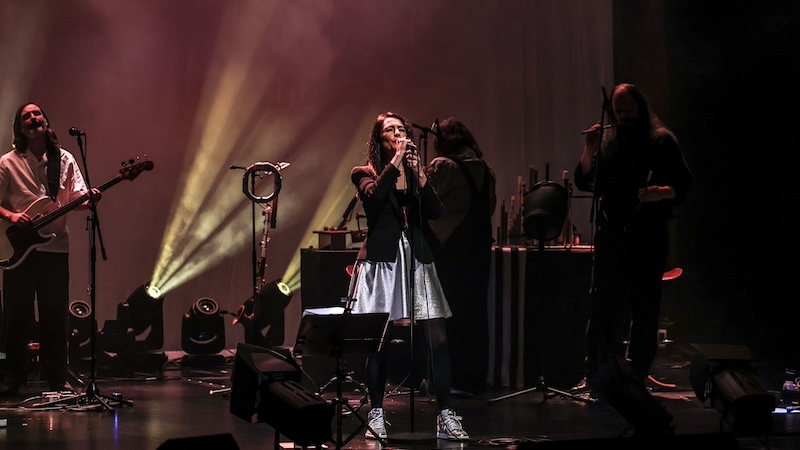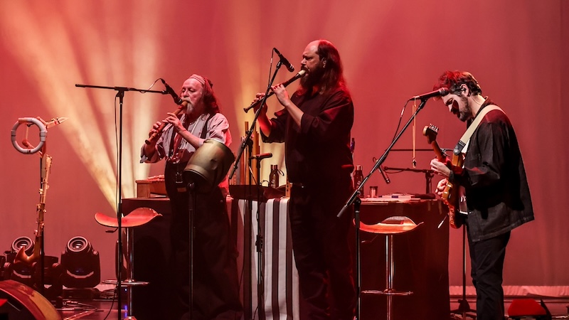 Loulé viu actuar no carismático cineteatro — muito bem composto de quem os esperava (sabendo bem ao que vinha) — Maria Antónia Mendes na voz, os irmãos Martins (Luís e Pedro da Silva) nas guitarras, Carlos Guerreiro nas flautas e instrumentos (em muito inventados), Nuno Prata no baixo, Sérgio Nascimento na bateria e com a participação especial de Gonçalo Marques nas flautas. O conceito de super-banda deriva das muitas vidas prévias destes músicos, desde o GAC (Grupo de Acção Cultural), aos Gaiteiros de Lisboa, passando por Deolinda, Naifa, Ornatos Violeta, ou Humanos, entre outros. Gente bem batida e com muita disposição em continuar a bater (e bem) de malho no bombo. Algum dia isto trará o desejado efeito… ou então não, e o simples motivo de existir no dizer traz um doce alívio, paz de espírito.