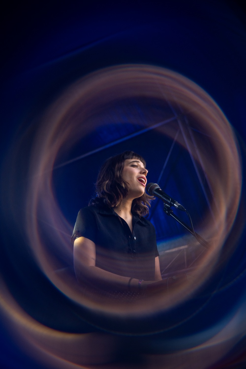 Começámos por escutar, no sábado, a pop comunitária de Bia Maria — música inquieta (e por vezes interventiva) do seu álbum de estreia Qualquer Um Pode Cantar, editado há quase um ano. Acompanhada de uma banda, não tivemos a experiência de assistir a Bia Maria com um coro — que certamente só iria enaltecer a dimensão vocal da performance e acrescentar camadas harmónicas —, mas a cantautora muniu-se das ferramentas que tinha ao dispor para uma actuação sólida.