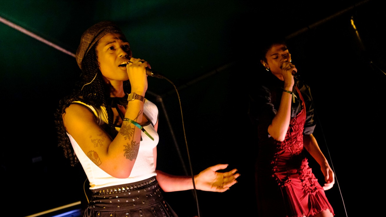 Daí passámos para as irmãs Yeri & Yeni, que nos últimos anos temos ouvido em colaborações com Branko ou Nayr Faquirá, elas que foram apadrinhadas de algum modo por Dino D’Santiago. Criadas na Linha de Sintra mas de raízes cabo-verdianas, apresentaram-se com o guitarrista Célio Cardoso. Irmãs gémeas, não só partilham a aparência como a própria voz — um tom doce que casa bem com melodias açucaradas de R&B e letras de (des)amor, mas que talvez pudesse ganhar maior alcance ou intensidade noutro tipo de canções, fossem mais sofridas ou uplifting, consoante o estado de espírito.