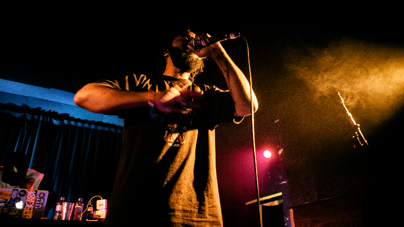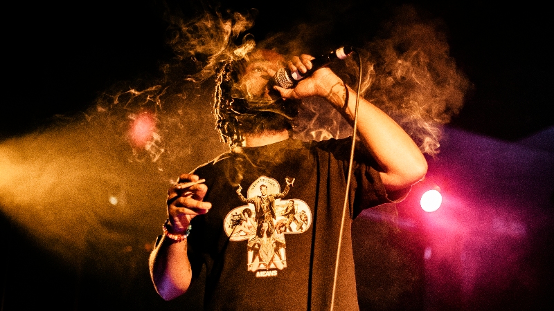 Na mesma linhagem estética do beatmaker português estava ewonee, também ele um artesão da batida e que no currículo enverga produções para Mach-Hommy, Tha God Fahim, Pink Siifu, Al.divino e para o próprio Fly Anakin. É ele quem assume funções de DJ na digressão que trouxe o MC à nossa capital e, como manda a tradição, é também o primeiro a subir ao palco para tentar arrancar algum ruído do público. “Se o Fly Anakin vos escutar a partir dos bastidores, ele aparece”; atirou como quem joga uma caixa inteira de acendalhas em cima de umas brasas. O entusiasmo da plateia ganhou a forma de ondas sonoras e não foi preciso esperar muito tempo até sermos notados pelo cabeça de cartaz da noite. Com a descontração que lhe é característica nos versos, Anakin surgiu em cena envolto numa neblina de THC. “Está na hora de trabalhar. E, para trabalhar, preciso de descontrair primeiro”, fez questão de explicar aos presentes, antes de deixar um agradecimento ao plug tuga que lhe conseguiu orientar um saco da famosa planta medicinal.