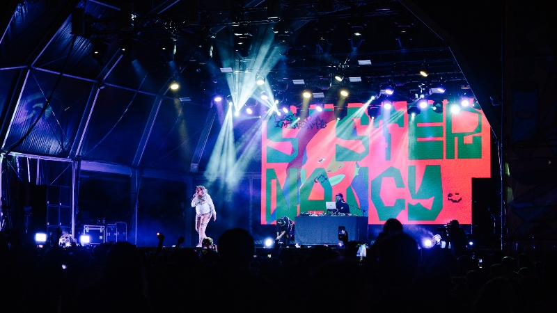 “Eu não sei dançar” é uma ressalva que Carla Prata não se cansa de fazer. Deste lado contrapomos, também incansavelmente, que a falta de jeito de pés é compensada pela qualidade da voz. Daí que não se entenda o apoio notório e continuado da artista nas suas próprias backs durante a terceira actuação do Palco Gasómetro no segundo dia de festival. Ainda para mais num concerto em que a cantora ( nascida em Londres) traz banda consigo — teclista, baterista e guitarrista que, por sinal, é incentivado por meia dúzia de fãs/amigos nas primeiras filas, que gritam por “Kiko” alto e bom som. Até porque, ademais, quando a voz da artista fura a música de fundo, sobressai o tom cristalino que, em muitos outros casos homólogos, só se verifica em estúdio. Mas esse é um factor que parece não fazer diferença para o público que veio para ver Carla — e que, até agora, leva o prémio de melhor primeira fila do festival. É às mulheres que as cantigas de sedução de Carla Prata se dirigem, e são, também, as mulheres que mais vibram com essas canções. Não há, aliás, melhor termo para caracterizar a sua música. No nosso tempo, pelos vistos, continua a haver uma coisa muito bonita que é a sedução. E nem a entrada de SleepyThePrince em cena destoa desta frequência. Bem pelo contrário. E, surpreendentemente, a voz do homem do capacete — que em palco se apresenta de óculos escuros e balaclava — soa muito mais límpida do que, por exemplo, no recentemente editado MELANCHOLIC DREAMS 3, cujo vídeo do single “ESTRELA DE ROCK” é reproduzido em pano de fundo. A anfitriã avisa o público para não esquecer este nome que tem “muito talento”. Registado. Mas, na hora de “Owner”, a plateia esquece tudo o que ficou para trás e atinge um estado delirante inédito. “Step in looking like the owner”, ouve-se da Matinha ao Tejo. Banda sonora do irresistível género Carla Prata and Chill.