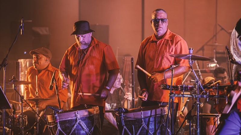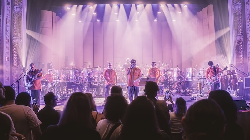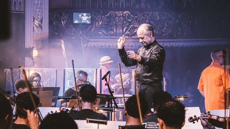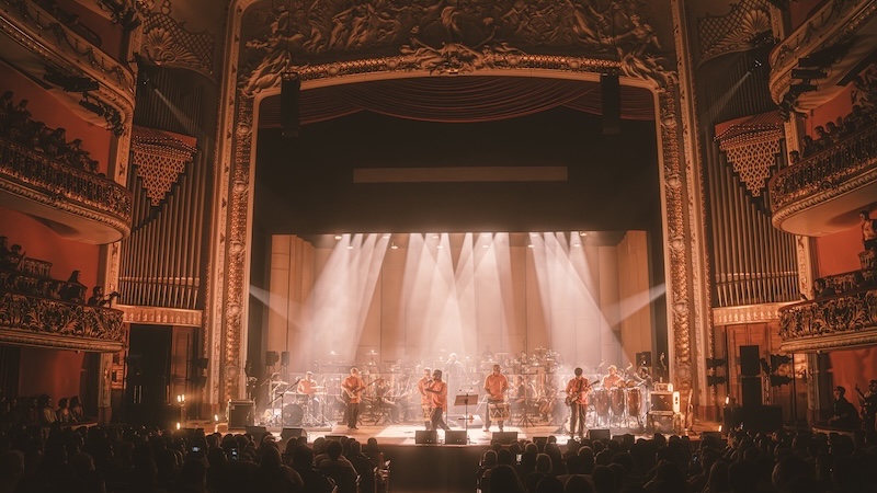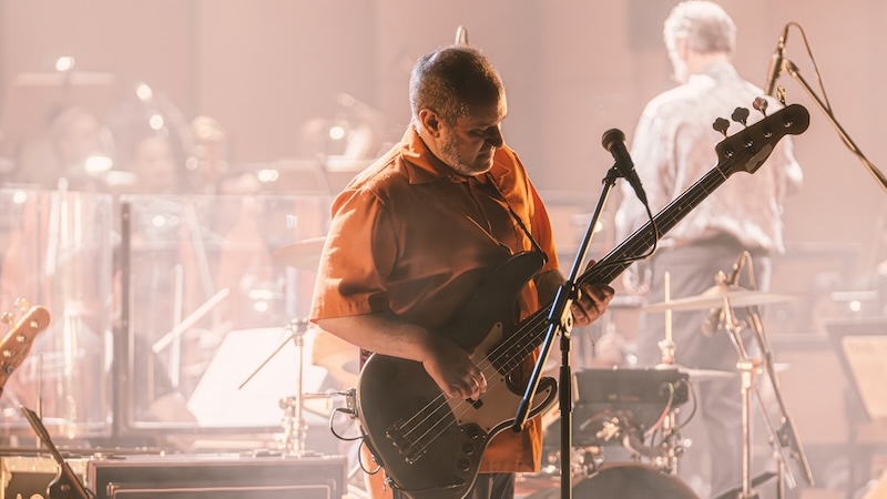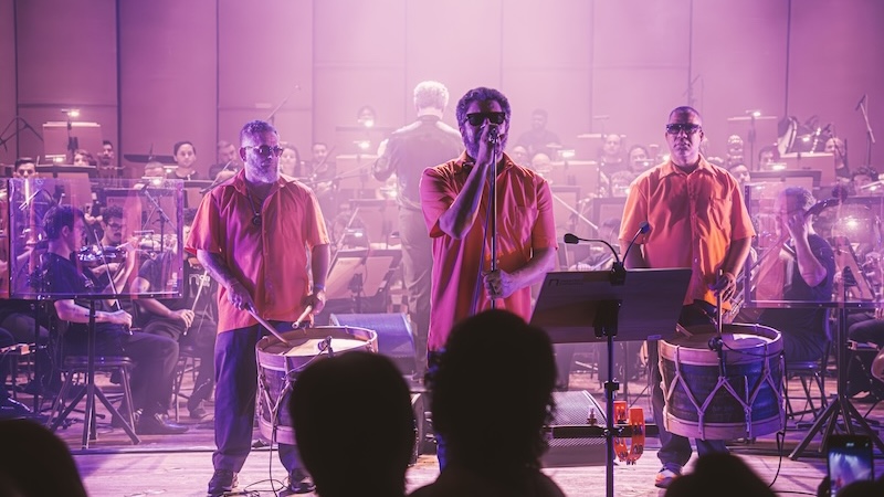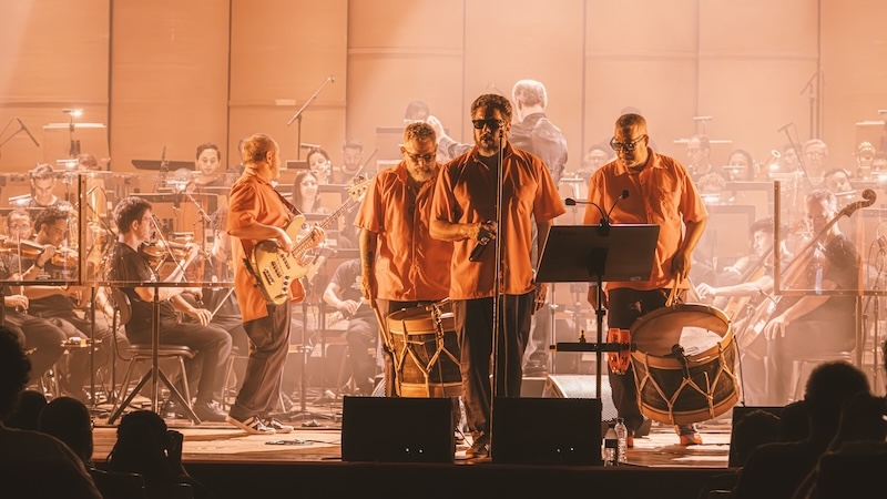 Quando as batidas do mangue começam, quem pode, dança. Quem não pode, mexe o corpo, balança a cabeça, bate os pés, canta. A pulsação se junta à delicadeza erudita. Ambas se complementam, criando algo ainda mais psicodélico. Hipnotiza. Algo que não tem como ignorar. Du Peixe é menos efusivo e performático que Science, mas nem por isso deixa o sarrafo abaixar. Sua voz rouca pontua bem. Quando não canta, assume a alfaia, a percussão ou a meia lua. Dengue é o único que se movimenta de uma extremidade à outra com toda a tranquilidade. Na maioria das vezes fica ao lado dos contrabaixistas da orquestra. Sem mudar a sequência do disco, as versões encorpadas pela orquestração de Mateus Alves (responsável pelas trilhas sonoras de filmes como Bacurau e O Agente Secreto) reverberam pela sala centenária do teatro de uma forma única. É impressionante a forma que as ondas batem nas paredes e se espalham, chegam aos ouvidos e descem pelo corpo todo.