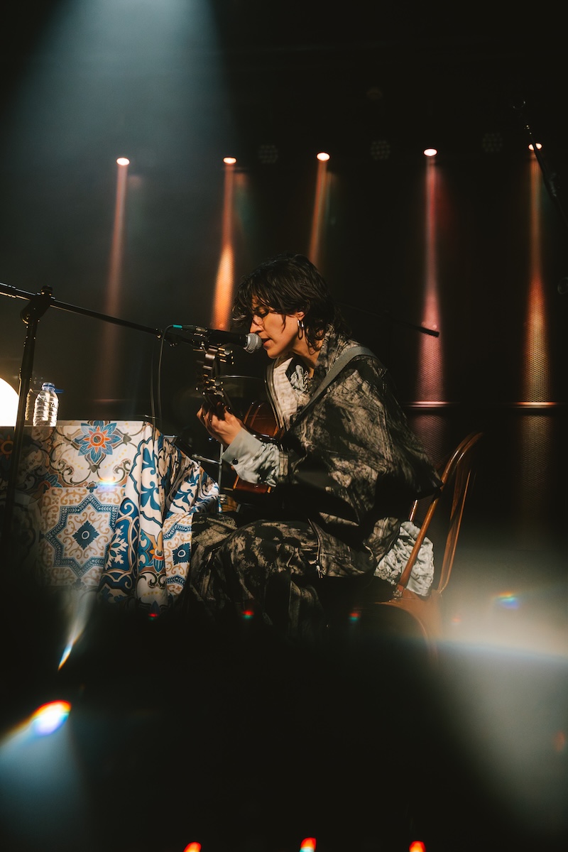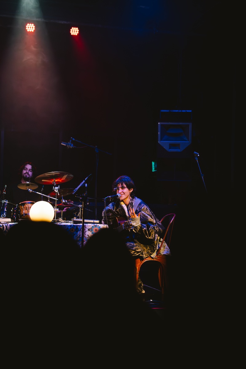 À chegada, salta desde logo à vista o vasto arsenal musical disposto de forma peculiar em cima de uma mesa coberta com uma toalha de cozinha. Percebe-se a ideia imediatamente: mais do que um concerto, esta ía ser uma oportunidade para ver e ouvir a artista portuense, há vários anos radicada em Londres, num registo íntimo e próximo daquele que tem em sua casa, que é simultaneamente o habitual laboratório para a formulação das suas canções. É, por norma, destes ambientes que nascem as melhores criações artísticas, longe do glamour dos estúdios apetrechados, em processos mais caseiros e mundanos que permitem passar para os temas o que os autores realmente sentem no preciso momento em que as ideias nascem, dada a facilidade com que, em casa, um músico pode rapidamente passar da cama para a secretária, de uma sessão de Netflix and chill para uma nova instância no Ableton Live ou Logic Pro, ou simplesmente gravar uma demo em voice memo enquanto tem um refogado ao lume.