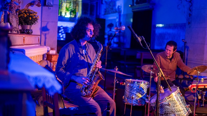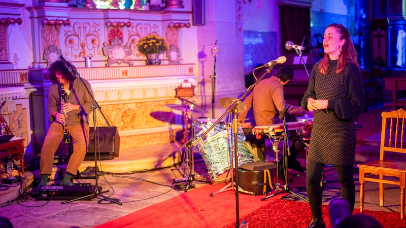 Ficar de boca aberta — para se expressar e respirar melhor, sonorizando o espaço, assim começa Almut Kühne a dar corpo sonoro à ideia contida em Stones and Seeds, junto a João Pedro Brandão em flauta traversal, saxofone alto, clarinete e pedaleira de orgão processada, e Marcos Cavaleiro na percussão e carrilhão. Foi em Fevereiro de 2024, aquando da edição desse ano do festival Porta Jazz, que Kühne, Brandão e Cavaleiro, numa inesperada e espontânea formação denominada de Vogel Brothers — entre outros três músicos, Nuno Trocado, Damian Cabaud e Pedro Melo Alves —, partilhavam saberes num ensemble solidário com músico Alfred Vogel. Ficávamos então de boca aberta perante a destreza vocal de Kühne. Aqui e agora, pequenas pedras a discursar sobre as peles e o chocalhar de bolotas nas mãos em concha propagam-se em mais que isso pela reverberação pretendida da Igreja do Espírito Santo, em Paredes de Coura. As pedras guardam uma história natural e as sementes contêm um potencial de nova vida. São como dois polos ligados num aqui e agora. De onde viemos e para onde vamos. Mapeiam-se trajectórias a cada conjunto sonoro nos primeiros respiros na flauta transversal de Brandão. Aqui escutam-se metáforas através dos sons. A voz conduz uma narrativa sem empregar uma palavra que seja, ziguezagueia no espaço com quem caminha livre num percurso motivational. Aqui a música sobe pelo lugar e ouve-se em exercícios cautos, numa respeitosa contenção. A que se deve? Ao fluxo que leva por diante e que se escuta errático, também ele itinerante. Fosse um rio e as pedras saltitariam no leito e as sementes flutuariam. Poesia sonora em igual medida se na vez fosse um vento a soprar. É um respirar a três, em sibilante medida. Um caminho longo, feito de motivações tímbricas a um ritmo dócil, sem deixar de respirar, continuamente. Havemos de lá voltar um dia pelas boas pistas deixadas no percurso.
