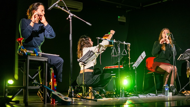 Seguiram-se as Novelo Vago, que têm no nome um emaranhado de propostas poético-sonoras a contar, apontam para um jogo de palavras com identidade. “Deus é a nossa mulher-a-dias que nos dá prendas que deitamos fora como a vida porque achamos que não presta”, deixou escrito a poetisa Adília Lopes para se apanhar e dar de volta. Vera Morais na voz e flautas, Inês Lopes no toy piano, melódica, campainhas e muito mais, e Teresa Costa na flauta transversal e sopros multicolores de brincadeira massajam-nos os tímpanos com desbravados flautins. A poesia de outros e outras intervalada pela delas, mesmo na medida em que a forma com que escrevem e improvisam nos temas se escuta poesia sonora pelo ar. Na voz, quando faltam as palavras sobejam onomatopeias, e que nada nos falte por escutar. Se a John Cage se deve essa “Suite for Toy Piano” servida para a coreografia “A Diversion” em 1948, outros lugares trazem de volta a razão de tocar em modo de brincar com temas a sério. Novelo Vago trazem a par O’Neill em “Canção de Embrulhar” com uma inocência em tudo propositada, no retomar dos versos trabalhados, quando nos traduzem por miúdos: “Boa noite meninos não / não levantar da cama / não ir pé ante pé ver os pais ao / quarto diz que eles são quatro foles / agarrados uns aos outros ar / quejando diz que é o amor” e assim por diante tal qual o poema. São poemas que se apanham por aí… como alguns instrumentos de brincar num bazares à beira da estrada, seja em Mesão Frio (como assumido) ou noutro lugar — e não arredamos pé dessa razão itinerante. De poeta em poeta, de música em música, de lugar em lugar, mesmo que sem sair por ora deste para saltar de poiso em poiso. Até que nos chegue o toque de despedida pelas palavras de outro dos eleitos, como em “Marc groets ‘s morgens de dingen” de Paul van Ostaijen, que é como quem diz: Marc cumprimenta as coisas pela manhã. Assim se fez vagamente um até à próxima paragem.