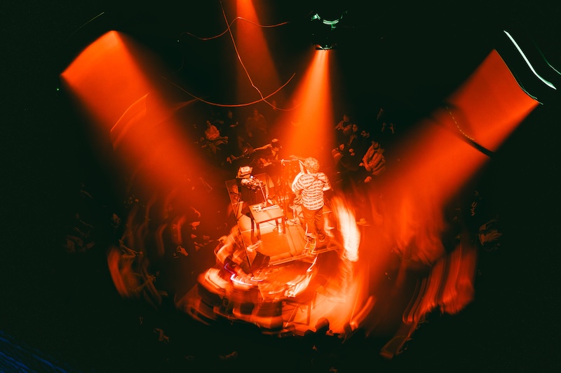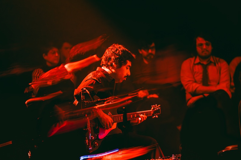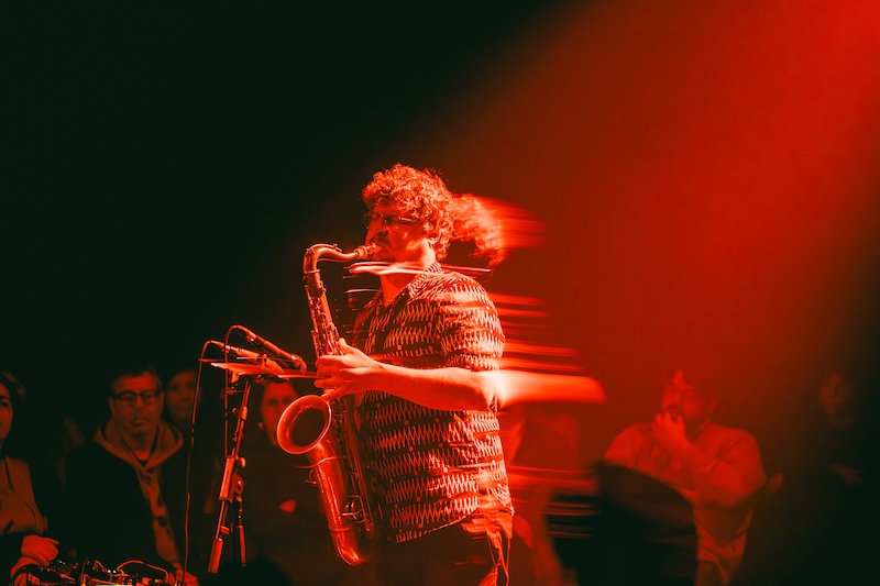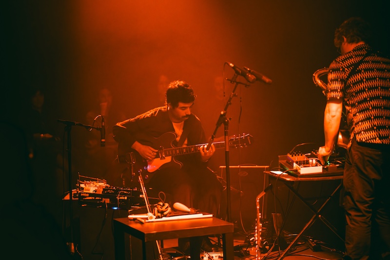 João Mortága usou flauta e saxofone alto na sua prestação, com dois microfones por diante com diferentes processamentos, tendo ainda um pequeno arsenal de pedais e processadores de sinal à sua disposição. Efeitos diversos era coisa de que também não carecia o setup de Tiago Sampaio, que tocou uma guitarra ultra planante e etérea ao longo de todo o concerto.