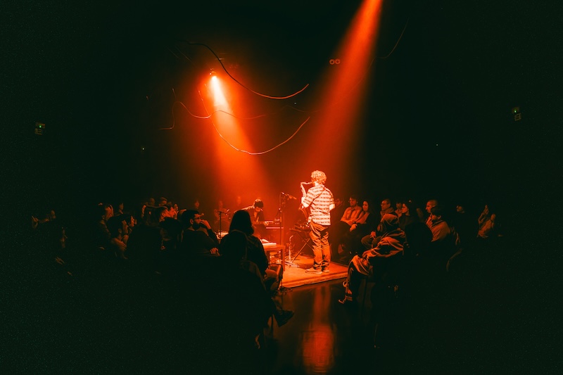 Posicionados no centro da sala, com as cadeiras dispostas em círculo ao seu redor, Sampaio e Mortágua surgiram após alguns minutos em que o público presente foi submetido a uma massagem aural através do que soava a um loop de flauta que logo impôs uma atmosfera imersiva, convidando-nos ao abandono da realidade em detrimento de uma dimensão sonora alternativa.