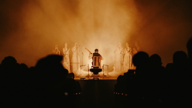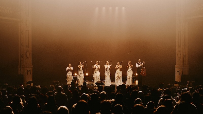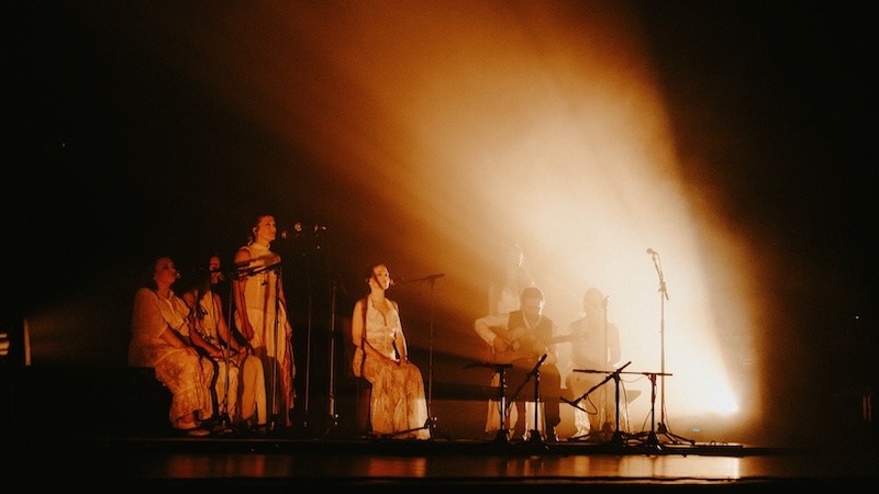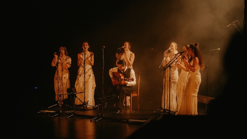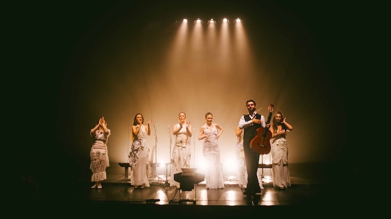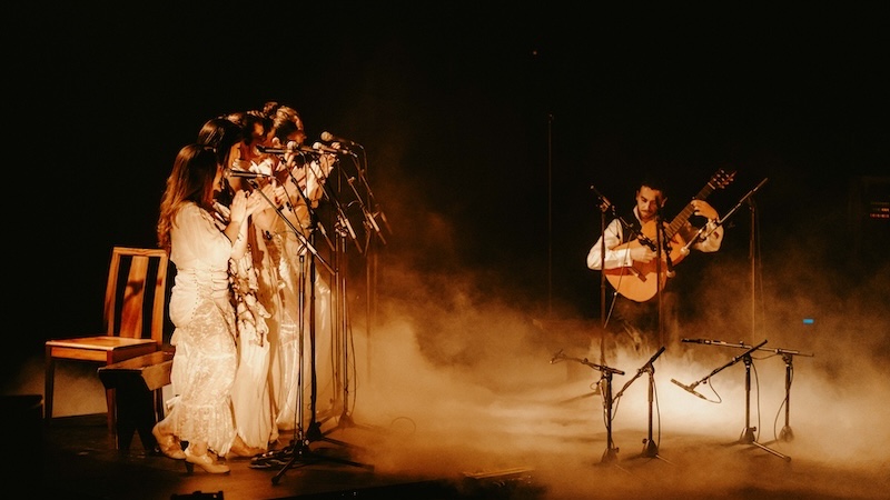 “Guitarra Coral” é o resultado final de um pensamento aturado sobre a forma que uma performance musical pode adquirir em palco: não há uma única palavra de saudação ao público e, no entanto, a comunhão é absoluta; a luz é pensada com máximo rigor e é, ela mesma, parte do jogo cénico pensado para máximo efeito emocional, com danças de luz branca e sombra perfeitamente gizadas; os figurinos das cantaoras são especiais e particulares, com cada uma das seis mulheres que ocupam o palco a surgirem em cena como se fossem noivas num filme de Tim Burton; o som é imaculado, não apenas na definição máxima impressa à guitarra e às harmonias vocais, às palmas e ao som grave resultante do bater dos tacões no soalho de madeira, mas nos subtis efeitos — quase dub, por vezes —, aplicados sobretudo às vozes, criando densas nuvens texturais que nos evolvem como um pesado e negro manto aural. O posicionamento dos sete corpos em palco é desenhado com precisão matemática, com Yerai Cortés a assumir diferentes lugares relativamente às cantaoras, num jogo que tem tanto de coreográfico quanto de estático. E mais do que o movimento, é a imobilidade que se privilegia. Quase parece pintura. Em suma, um espectáculo total e perfeito.