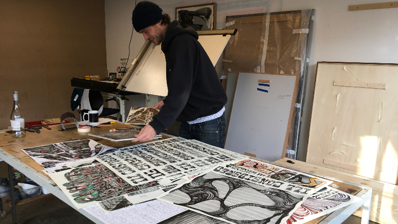 É isso, uma residência. Eu tenho um colectivo chamado High On Type. Somos todos calígrafos. Nós estamos lá todos, a trabalhar, e os visitantes podem entrar nas salas onde a arte está a ser produzida. É um ambiente muito fixe para se trabalhar, mas é também muito exaustivo. Termina já no sábado e, felizmente, depois disso não tenho mais nada agendado. Fico feliz porque preciso mesmo de assentar por um bocado. Gosto imenso de estar sozinho no estúdio. Sou capaz de passar semanas aqui, no silêncio, a pensar no que farei a seguir. E eu não costumo passar assim tanto tempo sem exposições. Por isso, estar dois ou três meses sem exposições é uma alegria imensa [risos].