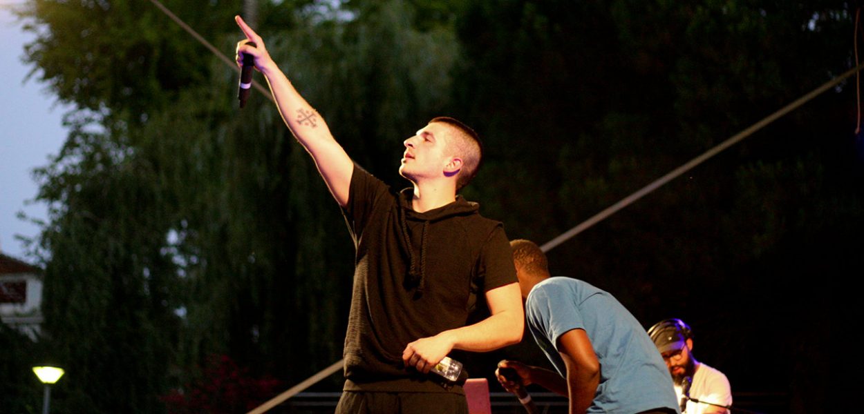 Mas foi aqui, na fronteira entre Carnide e Telheiras, que ProfJam e Mike El Nite cresceram e fizeram fluir o seu hip hop, que nada fica a dever ao som que vai sendo feito noutros bairros. Então é com um sorriso que vemos o reconhecimento da Junta de Freguesia aos seus rappers e, sobretudo, a um estilo: um palco virado para uma zona de relva que se vai enchendo de gente pausada, ao estilo de sunset de bairro, paredes-meias a uma horta urbana e a dar música a atletas de fim de tarde que vão trabalhando a resistência de pernas e glúteos em máquinas elípticas. Mike El Nite é o mestre-de-cerimónias da tarde/noite de Lisboa: nos pratos e com um microfone, saúda a plateia – onde há cabimento para todos: “franciscas” e “manueis”, também, claro que sim – e vai chamando ao palco os artistas da noite que se prolonga por quase duas horas.